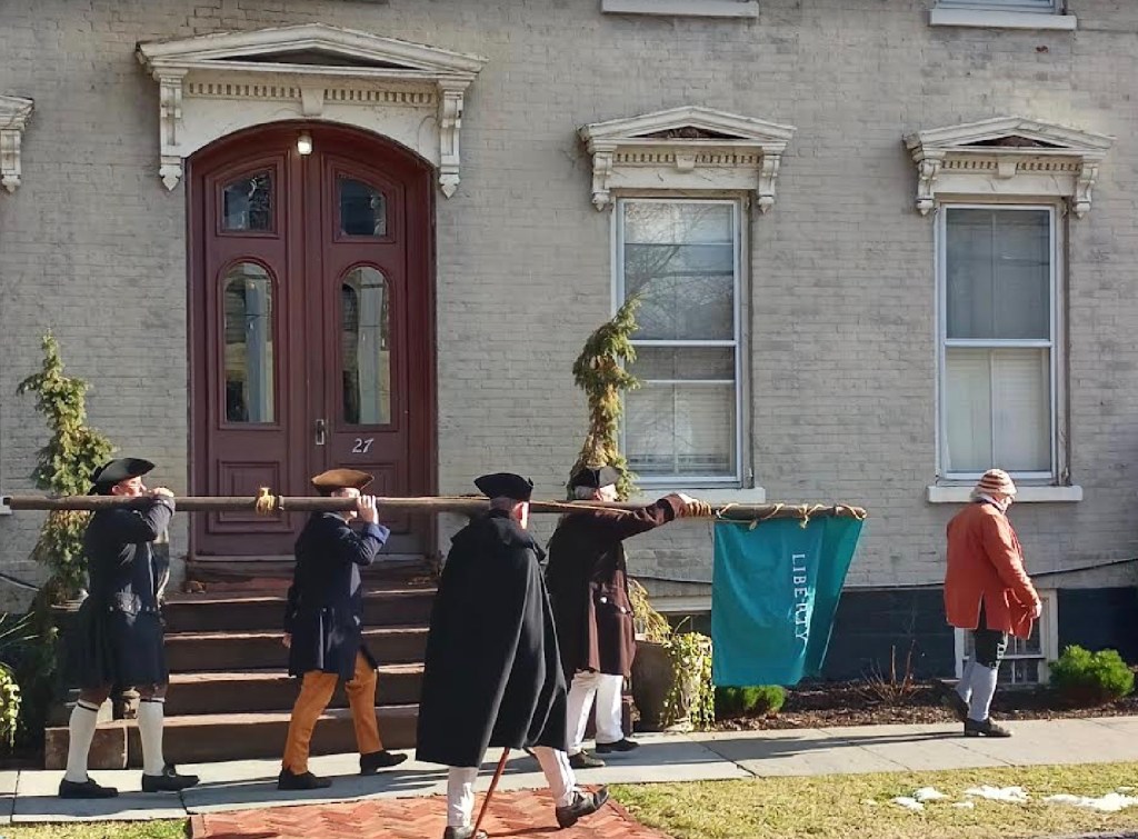 The event was a 250th Anniversary Commemoration of the Raising of the Second Liberty Pole in Schenectady on Friday, January 12 at noon.  Compared to a brisk winter day 250 years ago, the day turned out to be a rather pleasant, sunny mid-winter day with temperatures in the mid forties.  A reenactment of the mob of individuals dressed in period clothing to raise a pole with a “Liberty” flag created a memorable event.