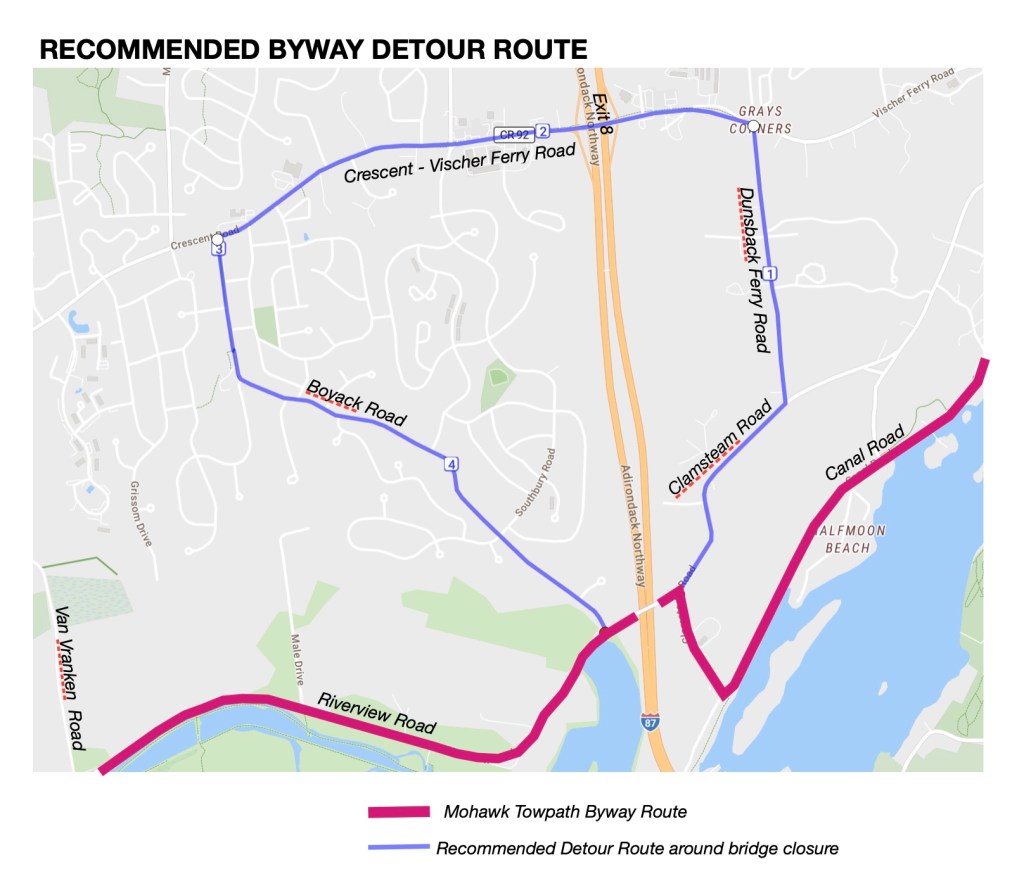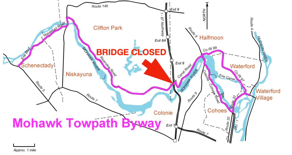 Riverview Road is closed at the bridge over I-87 Northway. Located in the Town of Halfmoon this is an important connector between the hamlets of Crescent and Vischer Ferry and the Vischer Ferry Nature and Historic Preserve on the Mohawk Towpath Byway.