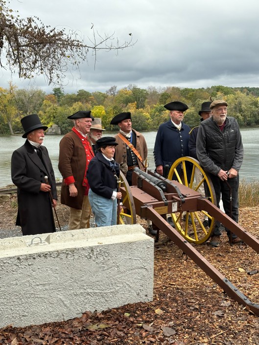 History records that cannons were fired along the canal to signal the approach of the Seneca Chief 200 years ago and was an important way of telegraphing the opening of the original Erie Canal before the telegraph, telephone, or internet. Following suit this fall, anyone who owns a canon or has access to a historic military device put it to a constructive use! Locally a group of re-enactors of the Albany Militia gathered to fire their canon as the Seneca Chief approached Ferry Drive in Clifton Park.