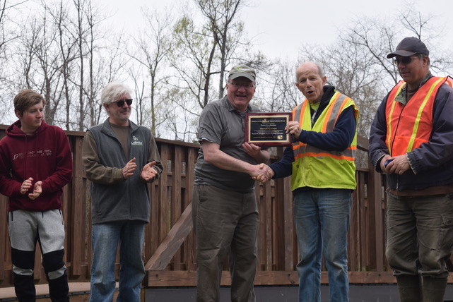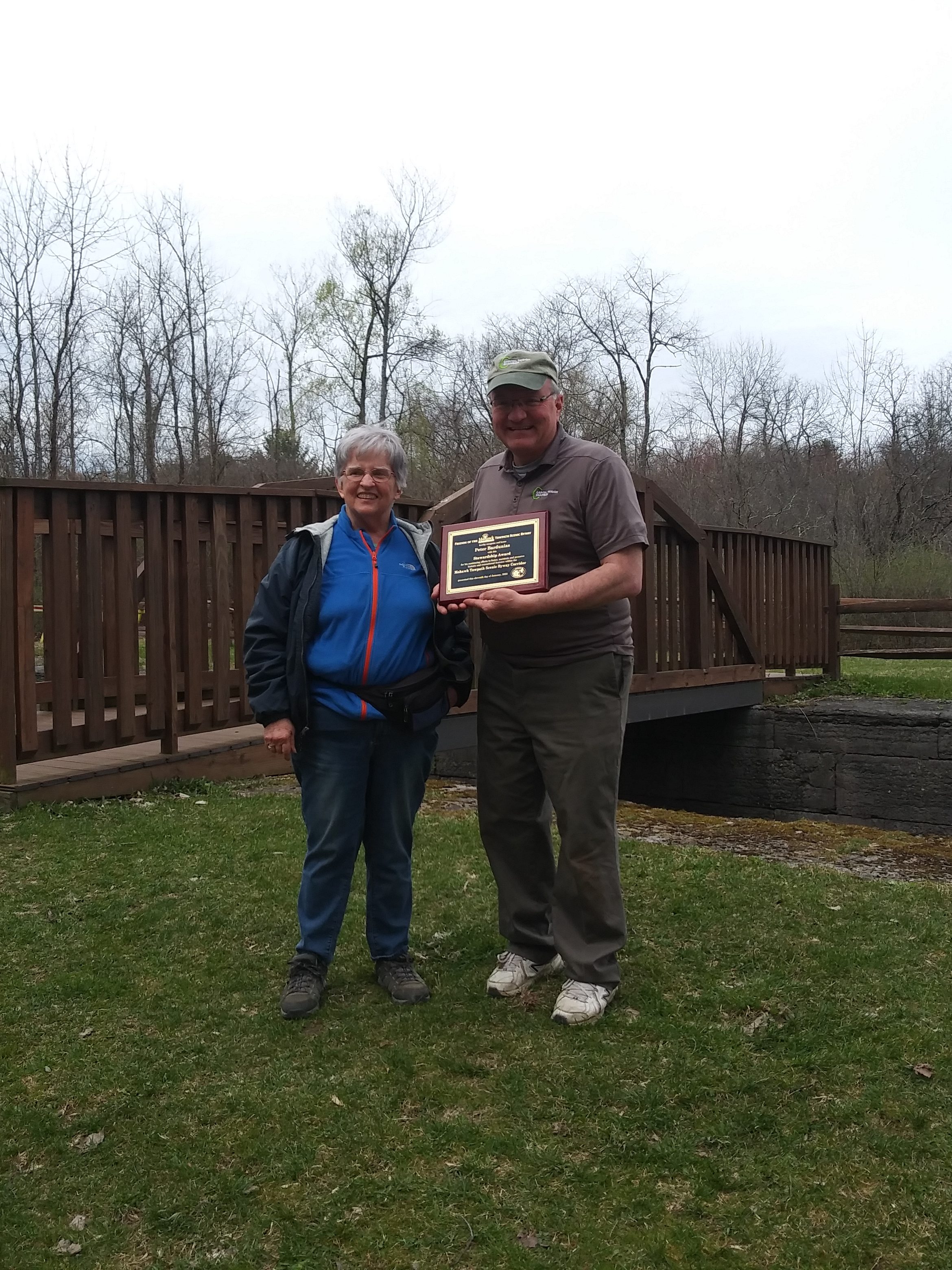 After lunch we went back down to Lock 19 and joined the celebration where Friends of the Byway gave a plaque to Peter Bardunias for his ten years of dedicated mowing and brush clearing around this beautiful double lock. Several years ago Peter also engaged a group of high school students to design and build a wooden footbridge across one chamber. Visitors can now more closely examine the second chamber which was doubled in length almost forty years after the first chambers were built. Peter was thankful for our clean up, and we were thankful for all his work all these years.