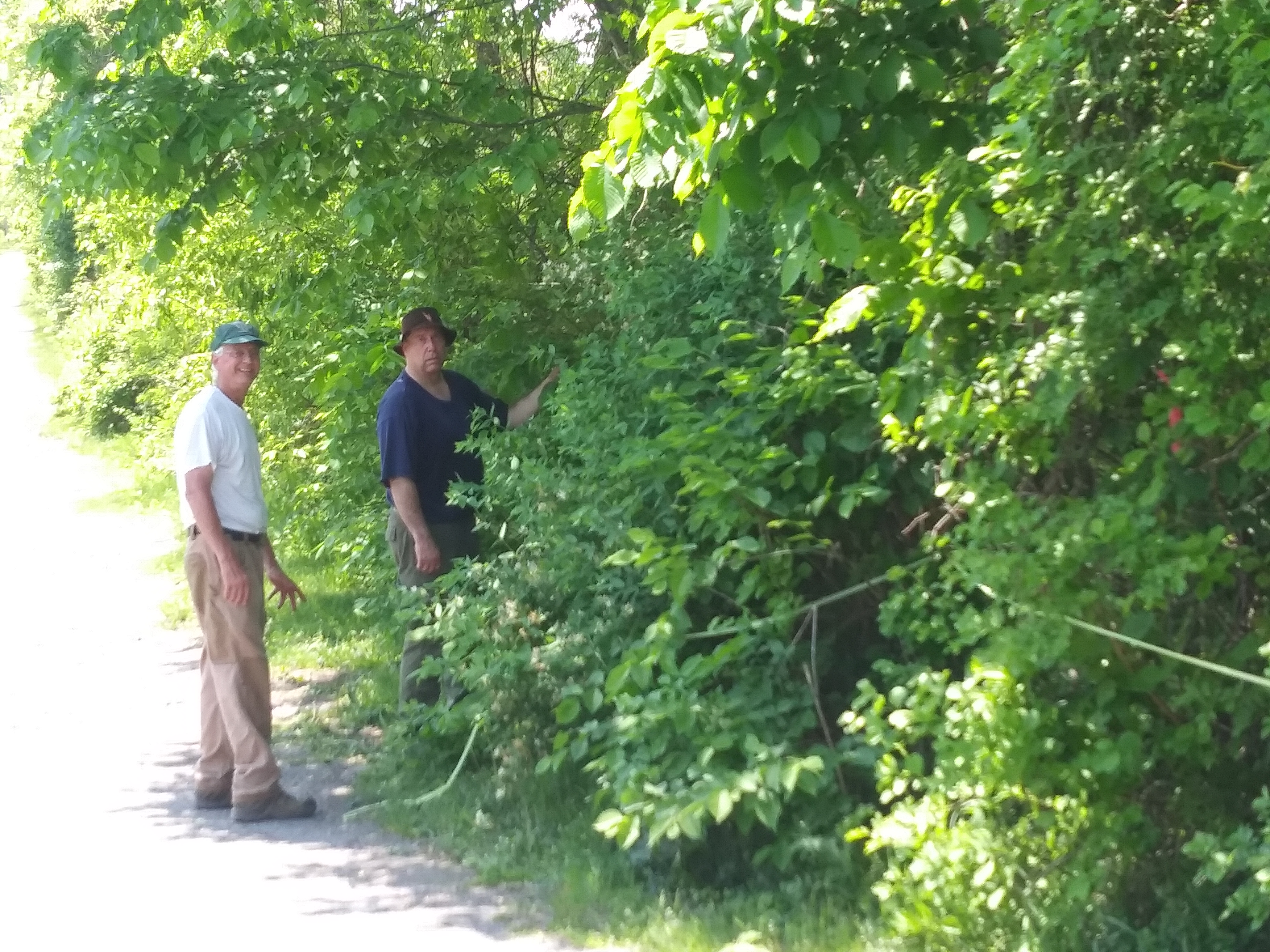 In this “before” Jeff Slater and Paul Olund stand near a mass of foliage with the main “old town road” trail seen behind them on the left. This is just south of the Whipple Bridge. The yellow survey tape is meant to mark the area where a number of invasive species including Asian bittersweet, multi floral rose, and honeysuckle have taken over. An occasional grape vine adds to the interwoven and braided mass. The red peaking through the foliage to the right is a chain link fence gate post that was historically closed during flood conditions. This is a “before” picture.