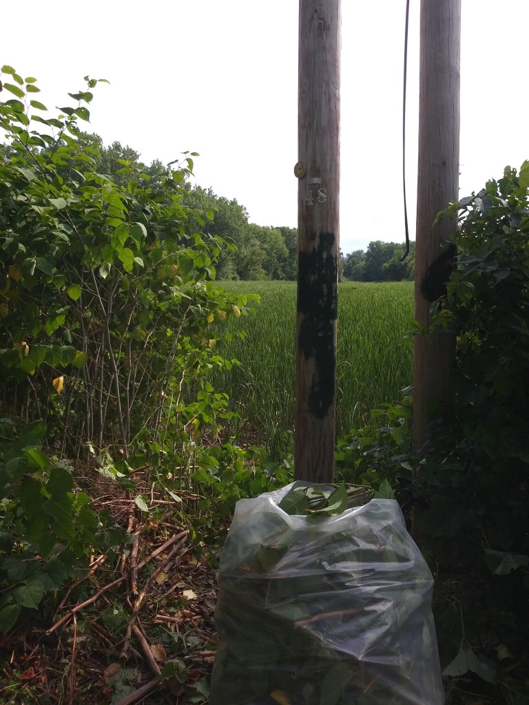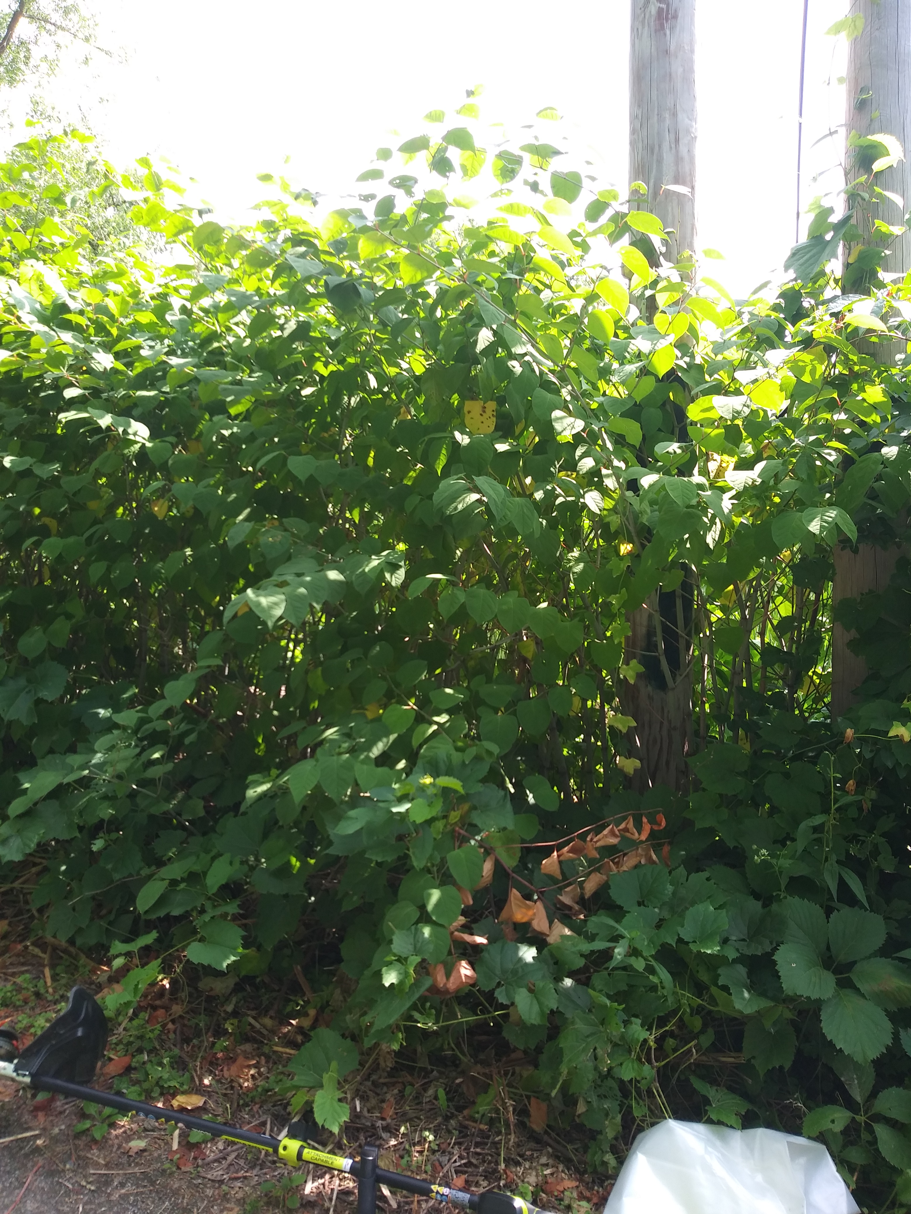 I spent the better part of an hour in the stand of Japanese Knotweed hacking out a sixty square foot area and generated over 50 pounds of debris. I will dispose of this in the garbage. If we are going to make a dent in this we have to attack it earlier in the season with repeated cuttings (try on a monthly basis?) during the growing season.